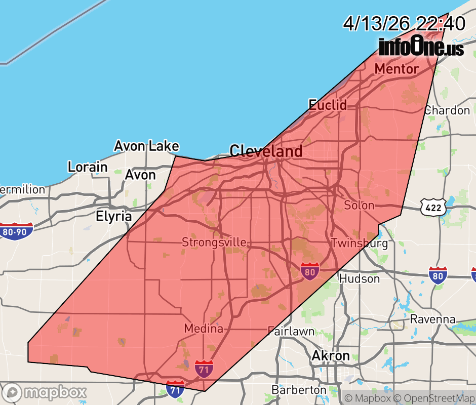 Canceled 4/13/26 11:30 PM Special Weather Statement issued April 13 at 10:37PM EDT by NWS Cleveland OH At 1037 PM EDT, Doppler radar was tracking strong thunderstorms along a line extending from 17 miles northwest of Lakeline to near Westlake to near Wellington. Movement was east at 20 mph. HAZARD...Wind gusts up to 50 mph. SOURCE...Radar indicated. IMPACT...Gusty winds could knock down tree limbs and blow around unsecured objects. Locations impacted include... Cleveland, Medina, Painesville, Willowick, Fairport Harbor, Parma, Lakewood, Euclid, Mentor, Cleveland Heights, Strongsville, Brunswick, Westlake, North Royalton, North Ridgeville, Solon, Willoughby, Hudson, Twinsburg, and Eastlake. ![]() |