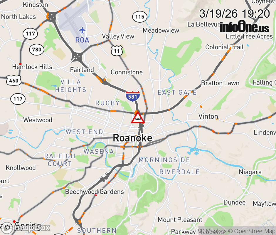 On I-581 at mile marker 1 in the City of Roanoke, motorists can expect delays due to a multi-vehicle crash. The south right shoulder is closed. The south entrance ramp narrows. Updated: Thu 3/19/26 7:20 PM EDT ![]() Updated: Thu 3/19/26 7:20 PM EDT |