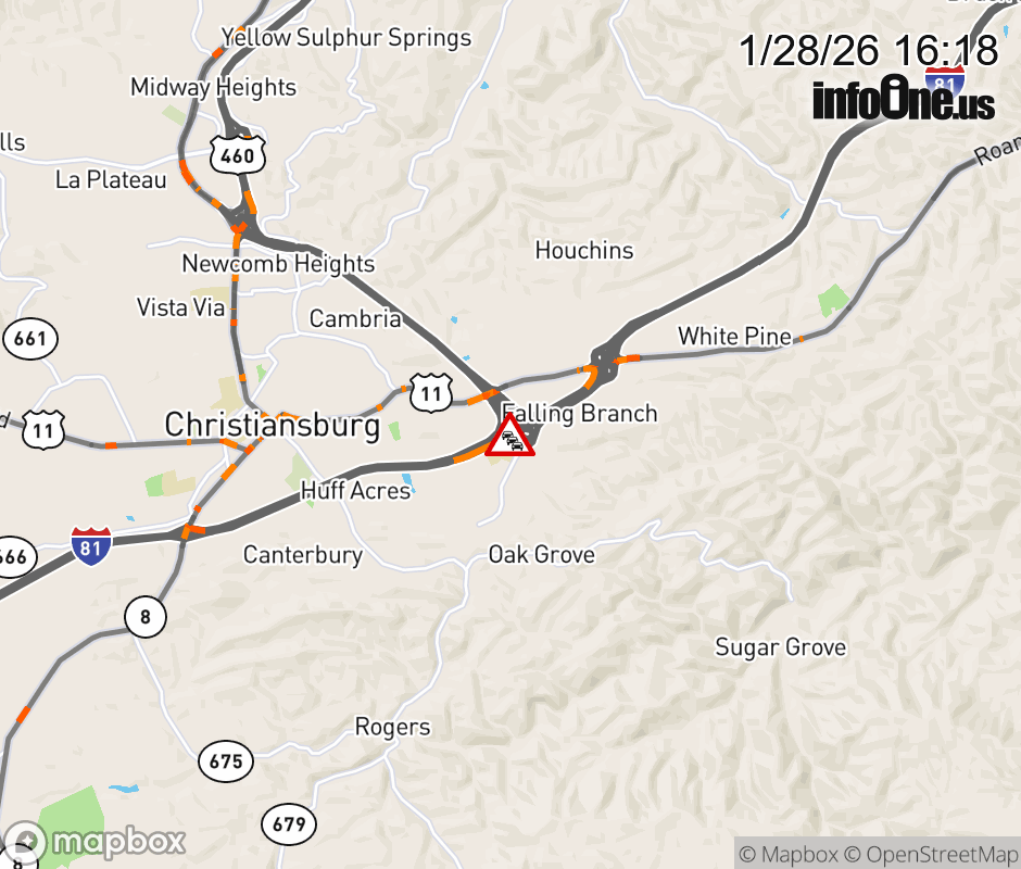 On I-81 at mile marker 117.4 in the County of Montgomery, motorists can expect delays due to an incident. The north left shoulder and left lane are closed. ![]() |