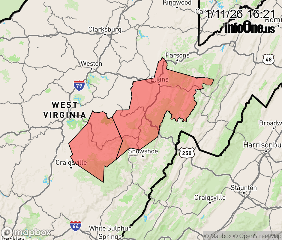 Canceled 1/11/26 11:00 PM Special Weather Statement issued January 11 at 4:20PM EST by NWS Charleston WV Snow showers will continue this evening at times, with up to an additional inch or two possible across the higher mountain elevations. Heavier snow showers could produce sudden visibility reductions. Additionally, gusty winds of 30 to 40 mph are possible, especially across the higher ridges. Those traveling this evening and overnight should be prepared for slick surfaces, especially across the higher terrain. Please allow for extra time to reach your destination. ![]() |