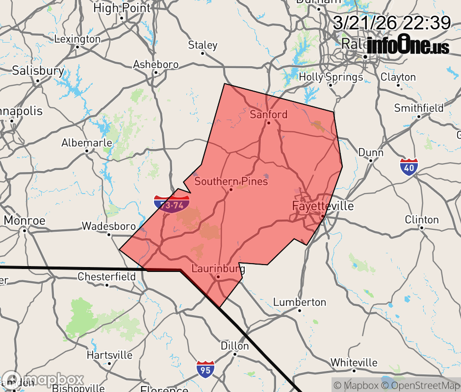 Canceled 3/21/26 11:30 PM Special Weather Statement issued March 21 at 10:38PM EDT by NWS Raleigh NC At 1038 PM EDT, Doppler radar was tracking a cluster of strong thunderstorms along a line extending from near Goldston to near Pinehurst to 6 miles west of Rockingham. Movement was east at 40 mph. HAZARD...Wind gusts in excess of 30 mph. SOURCE...Radar indicated. IMPACT...Gusty winds could knock down tree limbs and blow around unsecured objects. Locations impacted include... Fayetteville, Sanford, Laurinburg, Southern Pines, Rockingham, Raeford, Lillington, Carthage, Fort Bragg, and Pinehurst. This includes the following highways... US 1 between Mile Markers 69 and 76. Interstate 73 between Mile Markers 26 and 34. ![]() |