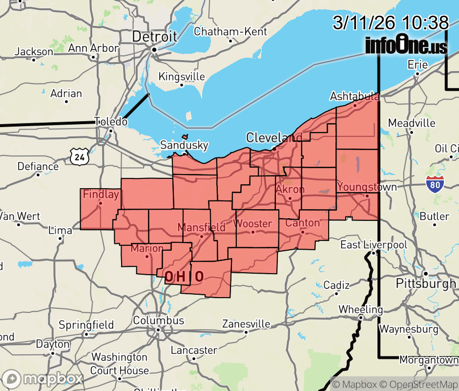 Canceled 3/11/26 12:17 PM Tornado Watch issued March 11 at 10:36AM EDT until March 11 at 5:00PM EDT by NWS Cleveland OH TORNADO WATCH 42 REMAINS VALID UNTIL 5 PM EDT THIS AFTERNOON FOR THE FOLLOWING AREAS IN OHIO THIS WATCH INCLUDES 24 COUNTIES IN NORTH CENTRAL OHIO ASHLAND CRAWFORD ERIE HURON KNOX LORAIN MARION MORROW RICHLAND IN NORTHEAST OHIO ASHTABULA CUYAHOGA GEAUGA HOLMES LAKE MAHONING MEDINA PORTAGE STARK SUMMIT TRUMBULL WAYNE IN NORTHWEST OHIO HANCOCK SENECA WYANDOT THIS INCLUDES THE CITIES OF AKRON, ALLIANCE, ASHLAND, ASHTABULA, AURORA, AUSTINTOWN, AVON LAKE, BAINBRIDGE, BOARDMAN, BRUNSWICK, BUCYRUS, BURTON, CANTON, CARDINGTON, CAREY, CHARDON, CHESTERLAND, CLEVELAND, CONNEAUT, CRESTLINE, EASTLAKE, ELYRIA, FINDLAY, FOSTORIA, GALION, GENEVA, HURON, KENT, KILLBUCK, LORAIN, MANSFIELD, MARION, MASSILLON, MEDINA, MENTOR, MIDDLEFIELD, MILLERSBURG, MOUNT GILEAD, MOUNT VERNON, NILES, NORTH RIDGEVILLE, NORWALK, ORRVILLE, PAINESVILLE, RAVENNA, RITTMAN, SANDUSKY, SOUTH RUSSELL, STREETSBORO, TIFFIN, UPPER SANDUSKY, WADSWORTH, WARREN, WICKLIFFE, WILLARD, WILLOUGHBY, WILLOWICK, WOOSTER, AND YOUNGSTOWN. ![]() |