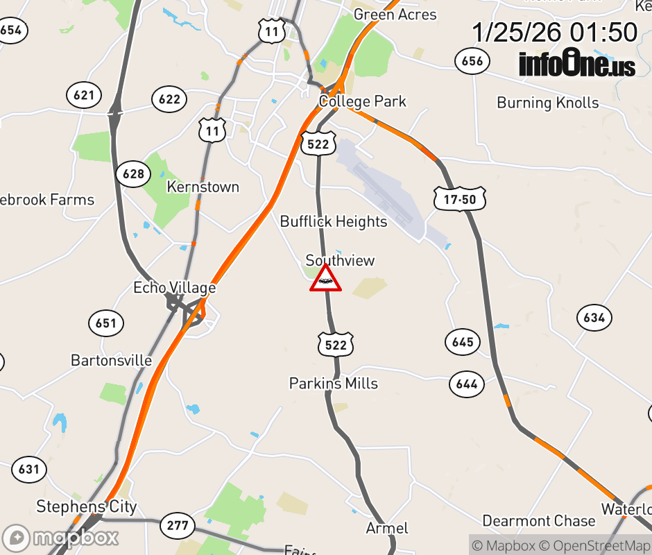 On US-522 in the County of Frederick, in the vicinity of Papermill Rd; Rt. 644N/S (Frederick County); /PAPER MILL RD, motorists can expect delays due to a vehicle crash. All north lanes are closed. All south lanes are closed. ![]() |