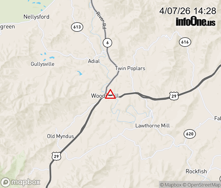 On US-29 in the County of Nelson, in the vicinity of Tidbit Trl; WYE VA-6E/W, motorists can expect delays due to a vehicle crash. The south left lane, right lane, and right shoulder are closed. ![]() |