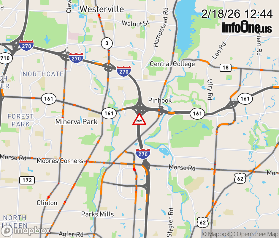 The left lane is blocked on I-270 North Collector at SR-161, due to a disabled vehicle. Updated: Wed 2/18/26 12:44 PM EST ![]() Updated: Wed 2/18/26 12:44 PM EST |
