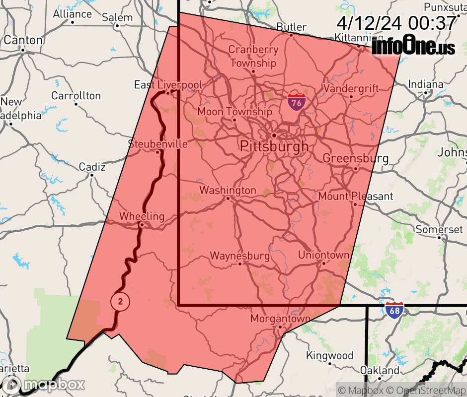 Canceled 4/14/24 12:37 AM Flood Warning issued April 12 at 12:36AM EDT until April 12 at 12:30PM EDT by NWS Pittsburgh PA * WHAT... Flooding caused by excessive rainfall is expected. * WHERE... Portions of east central Ohio, including the following counties, eastern Belmont, southeastern Columbiana, Jefferson OH and eastern Monroe, Pennsylvania, including the following counties, Allegheny, southern Armstrong, Beaver, southern Butler, Fayette, Greene, west central Indiana, southern Lawrence, Washington and western Westmoreland, and West Virginia, including the following counties, Brooke, Hancock, Marion, Marshall, Monongalia, Ohio, north central Preston and Wetzel. * WHEN... Until 1230 PM EDT Friday. * IMPACTS... Flooding of rivers, creeks, streams, and other low-lying and flood-prone locations is imminent or occurring. Numerous roads remain closed due to flooding. * ADDITIONAL DETAILS... - At 1233 AM EDT, emergency management reported heavy rain and flooding in the warned area. Flooding is ongoing. Between 1.5 and 3.5 inches of rain have fallen. - The heavy rain has ended, with light showers expected through early Friday morning. Additional rainfall amounts should be a quarter of an inch or less. - Some locations that will experience flooding include... Pittsburgh, Penn Hills, Mount Lebanon, Bethel Park, Ross Township, Morgantown, Wheeling, McCandless Township, Monroeville, Cranberry, Moon Township, McMurray, Greensburg, Weirton, McKeesport, Fairmont, Steubenville, Butler, Washington and Franklin Park. - http://www.weather.gov/safety/flood ![]() |