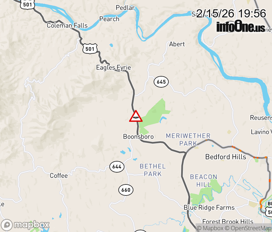 On US-501 South in the County of Bedford, in the vicinity of Winding Creek Ln; Rt. 647N/S (Bedford County), motorists can expect delays due to a vehicle crash. Lane closures exist. Updated: Sun 2/15/26 7:56 PM EST ![]() Updated: Sun 2/15/26 7:56 PM EST |