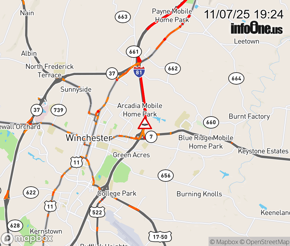 On I-81 North at mile marker 316 in the County of Frederick, motorists can expect delays due to a vehicle crash. Updated: Fri 11/7/25 7:24 PM EST ![]() Updated: Fri 11/7/25 7:24 PM EST |