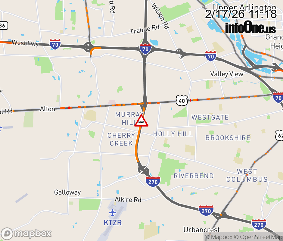 The left lane is blocked on I-270 South beyond US-40/W Broad St East, due to a crash. Updated: Tue 2/17/26 11:18 AM EST ![]() Updated: Tue 2/17/26 11:18 AM EST |