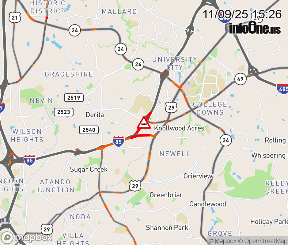 The right shoulder is closed past Exit 43 (University City Blvd). Updated: Sun 11/9/25 3:26 PM EST ![]() Updated: Sun 11/9/25 3:26 PM EST |