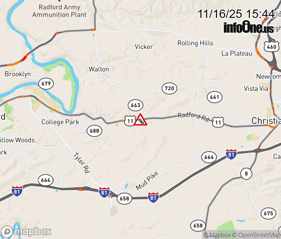 On Rt. 663 in the County of Montgomery, in the vicinity of Plum Creek Rd; Radford Rd; Spaulding Rd; US-11N/S, motorists can expect delays due to weather. All north lanes are closed. All south lanes are closed. ![]() |