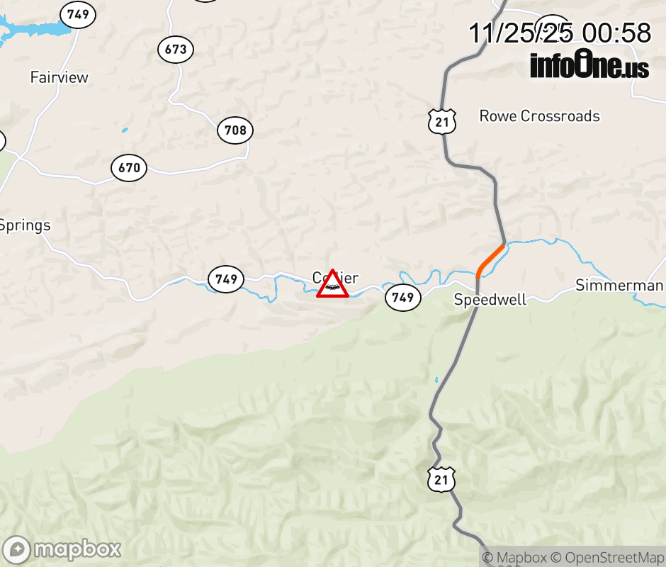 On Rt. 749 East in the County of Wythe, in the vicinity of Ward Branch Rd; Rt. 672N/S (Wythe County), motorists can expect delays due to a vehicle crash. Lane closures exist. ![]() |