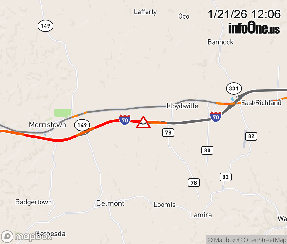Expect lane closures on I-70 East beyond SR-149/Belmont/Morristown, due to a crash. ![]() |