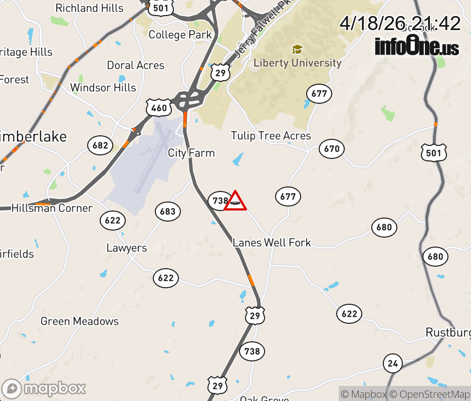 On Rt. 738 in the County of Campbell, in the vicinity of Wards Rd; US-29N, motorists can expect delays due to a vehicle crash. All north lanes are closed. All south lanes are closed. Updated: Sat 4/18/26 9:42 PM EDT ![]() Updated: Sat 4/18/26 9:42 PM EDT |