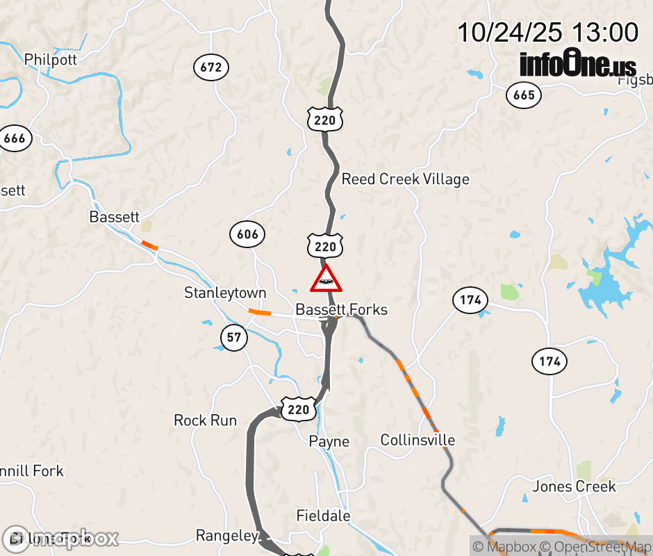 On US-220 South in the County of Henry, in the vicinity of Dyer St; Rt. 1210E/W (Henry County), motorists can expect delays due to a vehicle crash. Lane closures exist. ![]() |