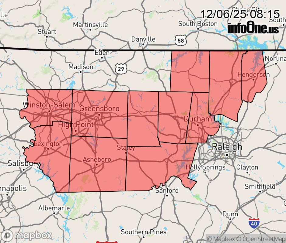 Canceled 12/6/25 10:15 AM Special Weather Statement issued December 6 at 8:13AM EST by NWS Raleigh NC Temperatures across much of the northern Piedmont in central North Carolina remain near freezing this morning. Patchy freezing fog is expected to continue through 10 am. Motorists will need to be alert to the possibility of slick spots from black ice. Motorists should exercise caution while driving...especially on bridges and overpasses. Allow for extra time to reach your destination and avoid sudden stops or accelerations. ![]() |
