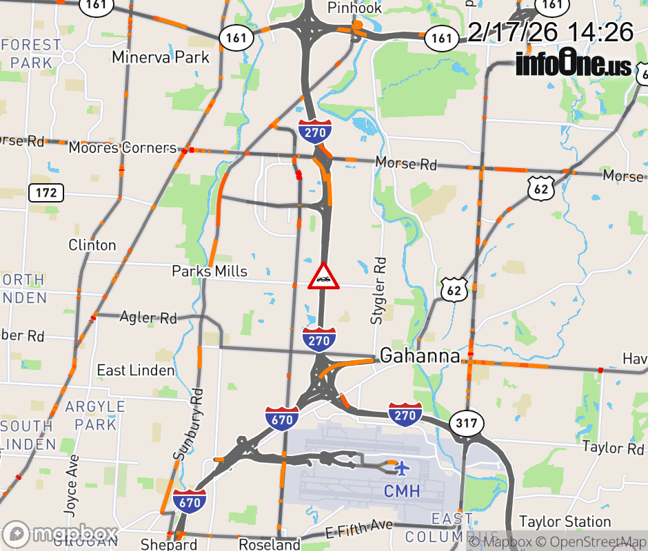 The right shoulder is blocked on I-270 North beyond US-62 East/Johnstown Rd, due to a disabled vehicle. Updated: Tue 2/17/26 2:26 PM EST ![]() Updated: Tue 2/17/26 2:26 PM EST |