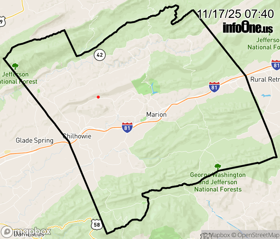 Canceled 11/17/25 8:00 AM Smyth County has 1 power outage affecting 4 customers. Appalachian Power 4 without power Marion: Customers affected: <5 (< 1%) Estimated repair: Mon 1:00 PM Updated: Mon 11/17/25 7:40 AM EST ![]() Updated: Mon 11/17/25 7:40 AM EST |
