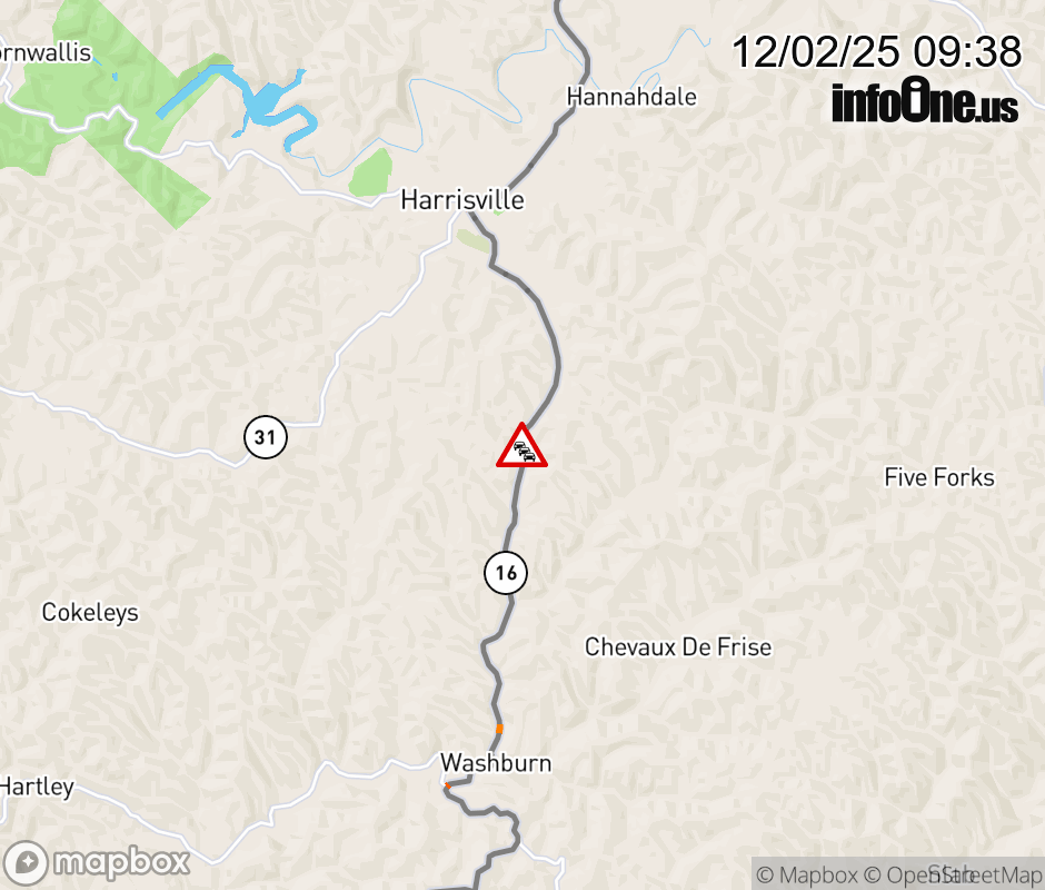 Road Closure on WV-16 (1397 Smithville Road). Comments:Closed until treated.Comments:road open Updated: Tue 12/2/25 9:38 AM EST ![]() Updated: Tue 12/2/25 9:38 AM EST |