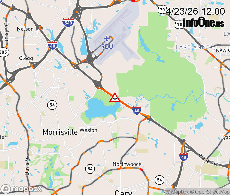 The right lane is closed before Exit 285 (Aviation Pkwy). ![]() Updated: Thu 4/23/26 12:00 PM EDT |