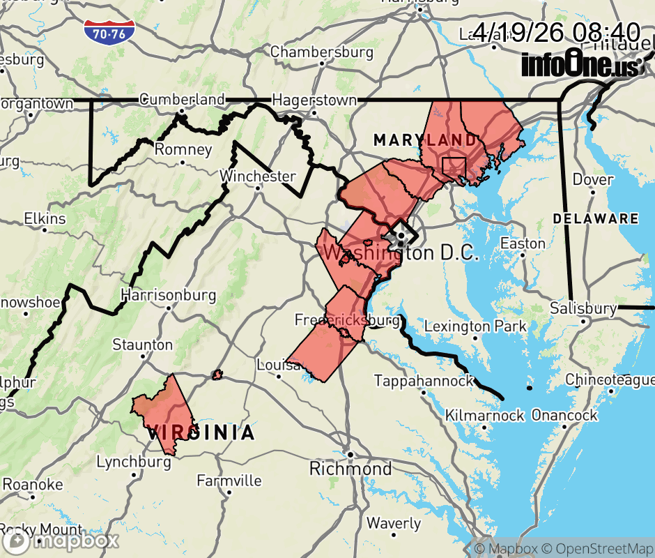 Freeze Watch issued April 19 at 8:38AM EDT until April 21 at 10:00AM EDT by NWS Baltimore MD/Washington DC * WHAT... Sub-freezing temperatures as low as 29 to 32 degrees possible, especially northwest of Interstate 95. * WHERE... In Maryland, Central and Southeast Howard, Central and Southeast Montgomery, Southeast Harford, and Southern Baltimore Counties. In Virginia, Albemarle, Nelson, Spotsylvania, Central and Southeast Prince William/Manassas/Manassas Park, Fairfax, and Stafford Counties. * WHEN... From late Monday night through Tuesday morning. * IMPACTS... Frost and freeze conditions could kill crops, other sensitive vegetation and possibly damage unprotected outdoor plumbing. ![]() |