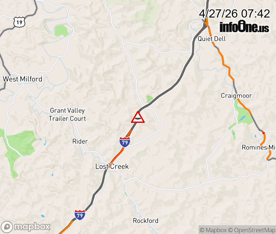 Vehicle Crash on I-79N at Mile Marker 111.5. Comments:Lost Creek Area. Updated: Mon 4/27/26 7:42 AM EDT ![]() Updated: Mon 4/27/26 7:42 AM EDT |