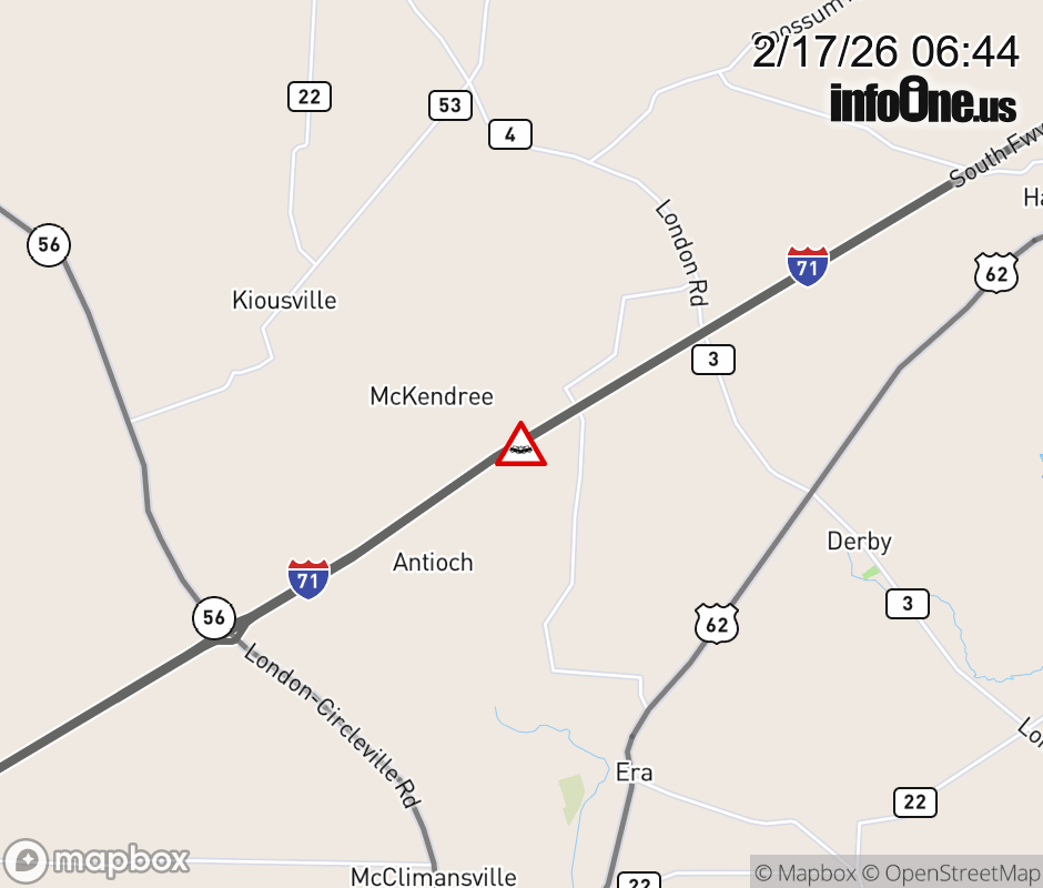 The right lane is closed on I-71 North beyond SR-56/London/Mt Sterling, due to a crash. Updated: Tue 2/17/26 6:44 AM EST ![]() Updated: Tue 2/17/26 6:44 AM EST |