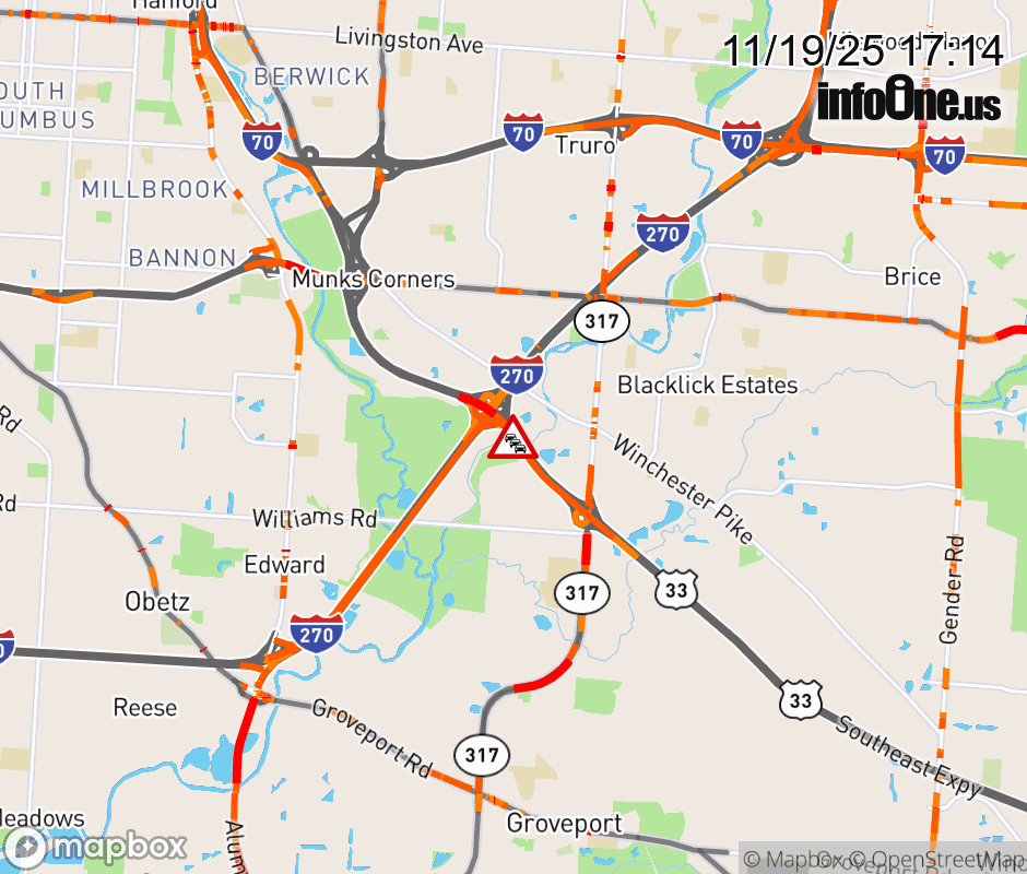 The right lane is blocked on US-33 East beyond I-270 North, due to a police incident. Updated: Wed 11/19/25 5:14 PM EST ![]() |