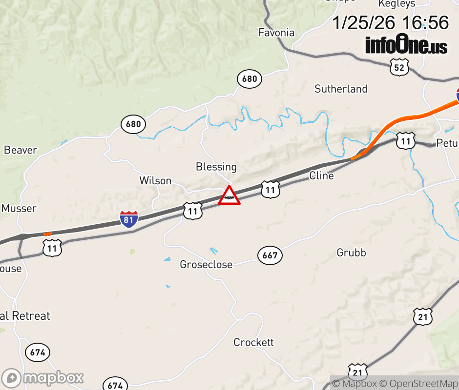On I-81 at mile marker 64.7 in the County of Wythe, motorists can expect delays due to a tractor trailer crash. The north right lane and right shoulder are closed. Updated: Sun 1/25/26 4:56 PM EST ![]() Updated: Sun 1/25/26 4:56 PM EST |