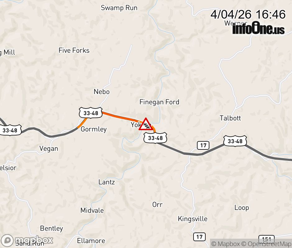 Road Closure on US-33W at Mile Marker 0.05. Comments:Due to an ATV crash on a side road.Comments:Due to an ATV crash on a side road. Updated: Sat 4/4/26 4:46 PM EDT ![]() Updated: Sat 4/4/26 4:46 PM EDT |