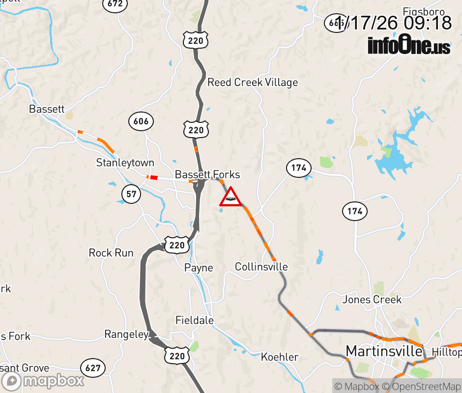 On BUS US-220 in the County of Henry, in the vicinity of Seminole Dr; Rt. 797N/S (Henry County); / SEMINOLE DR, motorists can expect delays due to a vehicle crash. All south lanes are closed. Updated: Sat 1/17/26 9:18 AM EST ![]() Updated: Sat 1/17/26 9:18 AM EST |