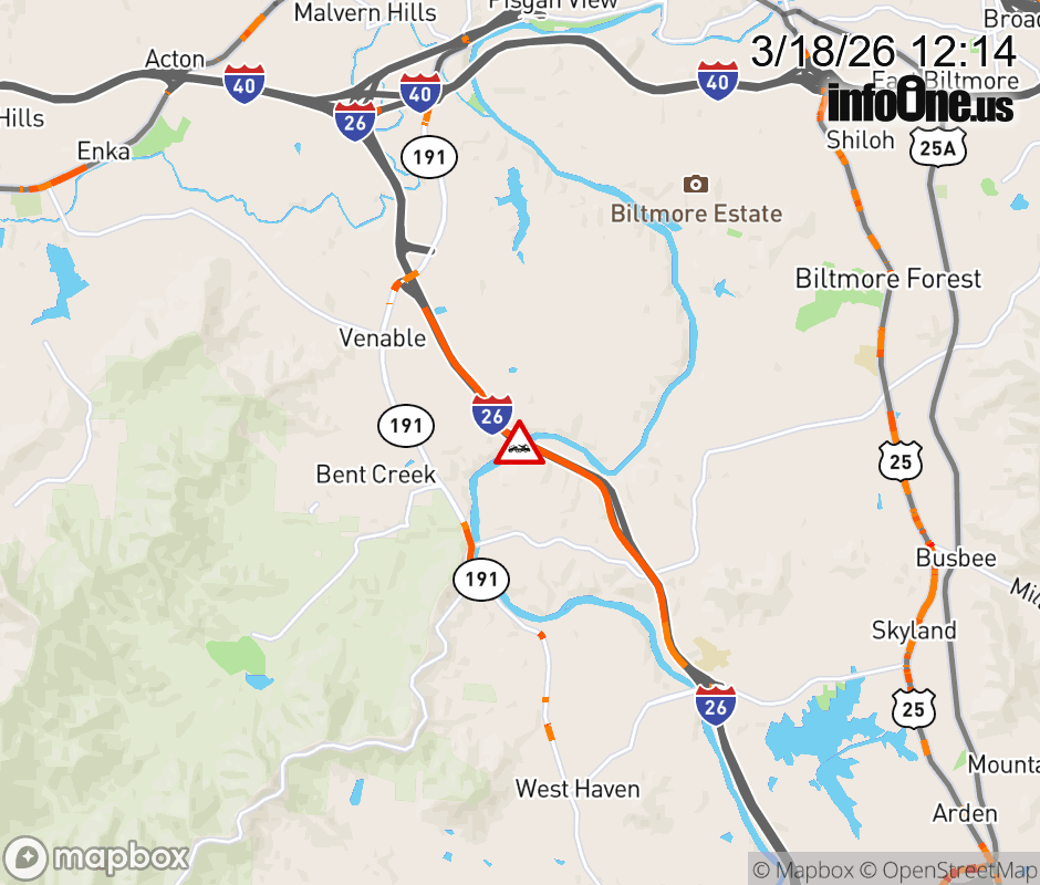 The right lane is closed three miles east of Exit 33, NC 191 (Brevard Road). ![]() |