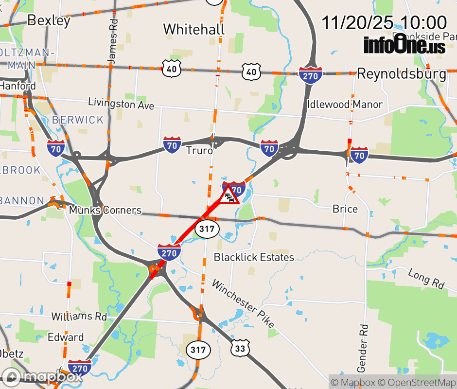 The right lane is blocked on I-270 North beyond US-33, due to repairs/maintenance. Updated: Thu 11/20/25 10:00 AM EST ![]() |