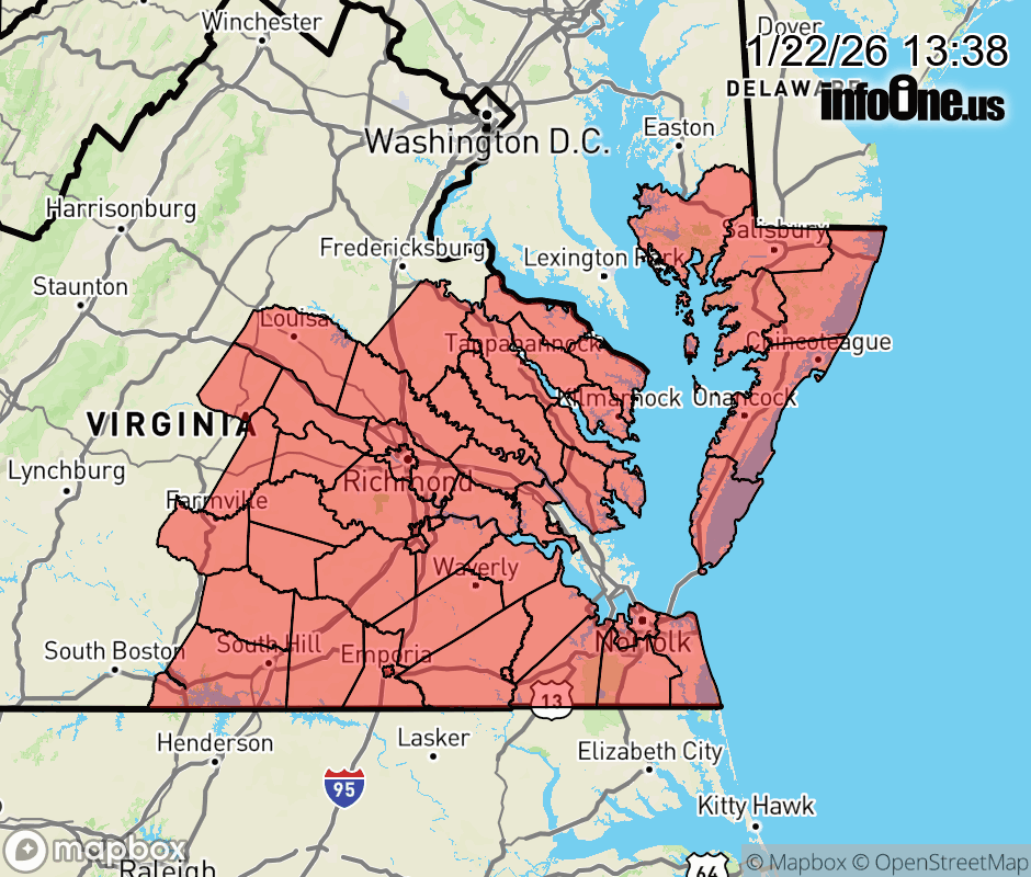 Canceled 1/22/26 1:42 PM Cold Weather Advisory issued January 22 at 1:36PM EST until January 24 at 10:00AM EST by NWS Wakefield VA * WHAT... Very cold wind chills between 5 below to 5 above expected. * WHERE... Portions of southeast Maryland and central, east central, eastern, north central, south central, and southeast Virginia. * WHEN... From 8 PM Friday to 10 AM EST Saturday. * IMPACTS... The cold wind chills as low as 5 below could result in hypothermia if precautions are not taken. ![]() |