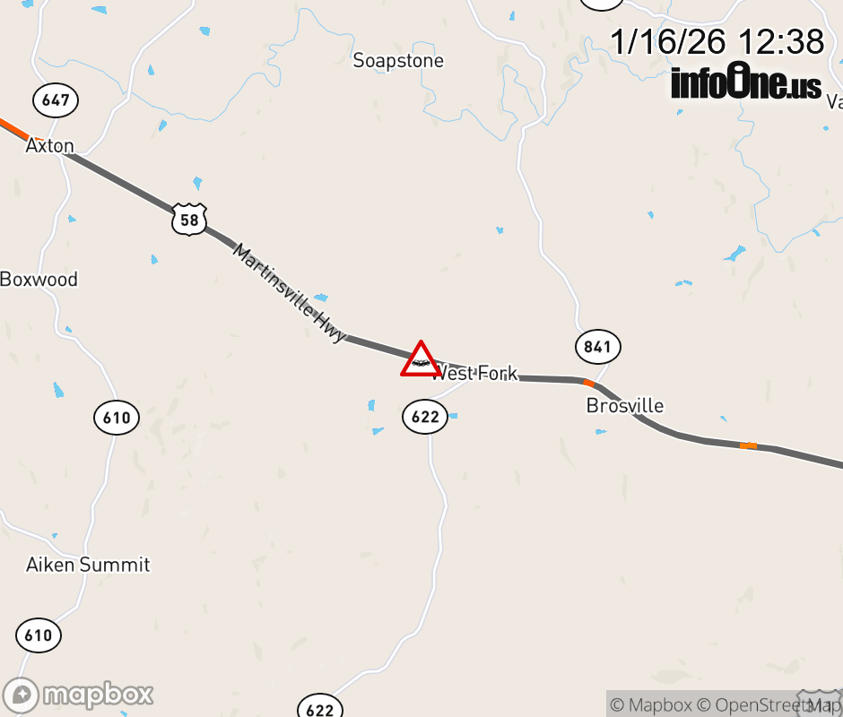 On US-58 West in the County of Pittsylvania, in the vicinity of Marlin Rd; Rt. 955N/S (Pittsylvania County), motorists can expect delays due to a vehicle crash. Lane closures exist. ![]() |