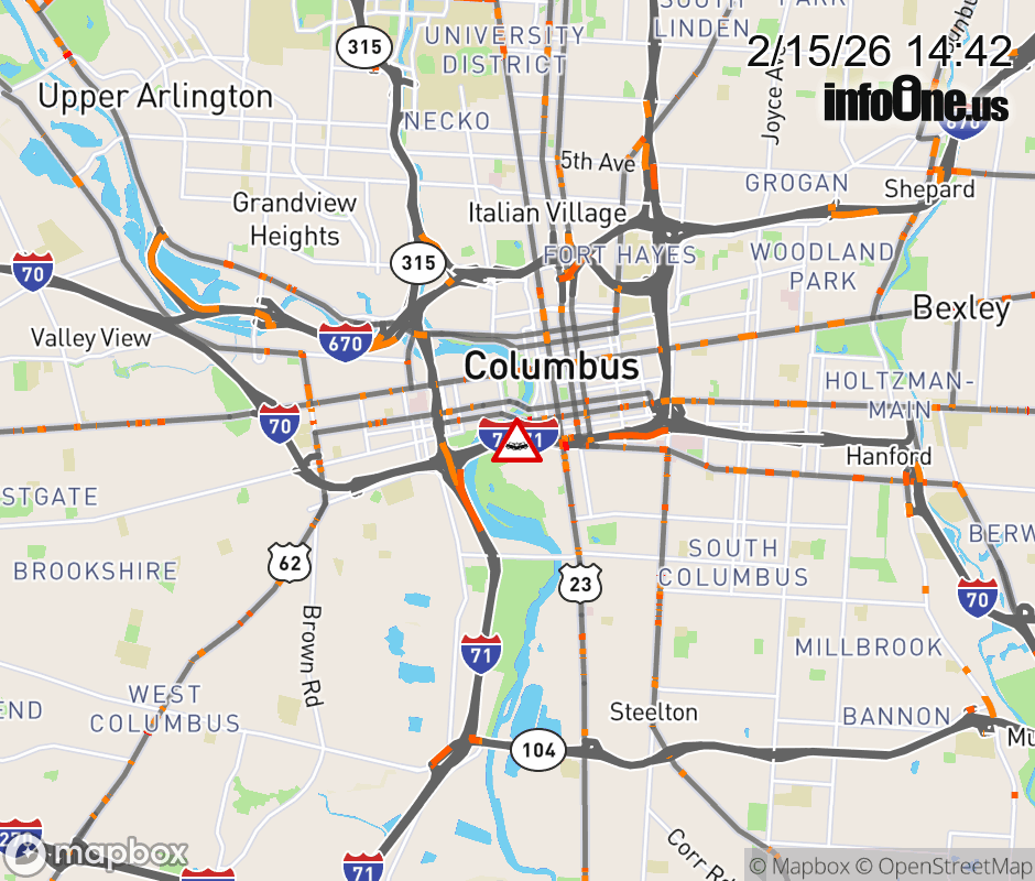 The right lane is blocked on I-70 East/I-71 North at US-23 South/Front St/High St, due to a crash. ![]() |