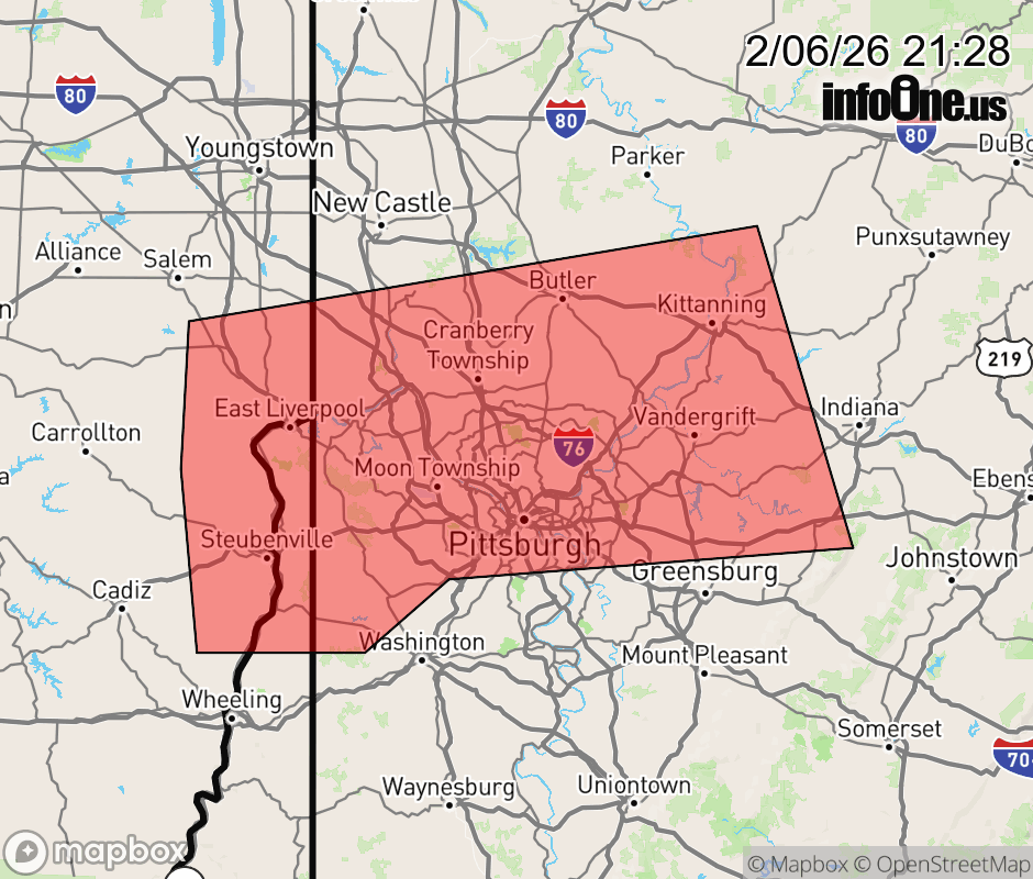 Canceled 2/6/26 9:51 PM Snow Squall Warning issued February 6 at 9:27PM EST until February 6 at 10:15PM EST by NWS Pittsburgh PA The National Weather Service in Pittsburgh has issued a * Snow Squall Warning for... Southeastern Columbiana County in east central Ohio... Jefferson OH County in east central Ohio... Allegheny County in southwestern Pennsylvania... Northwestern Washington County in southwestern Pennsylvania... Northern Westmoreland County in southwestern Pennsylvania... Armstrong County in west central Pennsylvania... Southern Butler County in west central Pennsylvania... Southwestern Indiana County in west central Pennsylvania... Beaver County in western Pennsylvania... Southern Lawrence County in western Pennsylvania... Brooke County in northern West Virginia... Hancock County in northern West Virginia... * Until 1015 PM EST. * At 927 PM EST, a hazardous snow squall was located along a line from 6 miles southeast of Ford City to 6 miles northwest of Wintersville, or along a line from 8 miles southeast of Kittanning to 9 miles northwest of Steubenville, moving south at 35 mph. HAZARD...Intense bursts of heavy snow and gusty winds leading to blowing snow and rapidly falling visibility. Wind gusts up to 35 mph. SOURCE...Radar indicated. IMPACT...Travel will become difficult and potentially hazardous within minutes. * Locations impacted include... Pittsburgh, Penn Hills, Mount Lebanon, Bethel Park, Ross Township, McCandless Township, Monroeville, Cranberry, Moon Township, Weirton, McKeesport, Steubenville, Butler, Franklin Park, East Liverpool, Aliquippa, Beaver Falls, Monaca, Vandergrift and East Palestine. This includes the following highways... Parkway North between mile markers 1 and 13. Interstate 79 in Pennsylvania between mile markers 52 and 96. Interstate 376 between mile markers 23 and 84. Pennsylvania Turnpike between mile markers 7 and 63. ![]() |