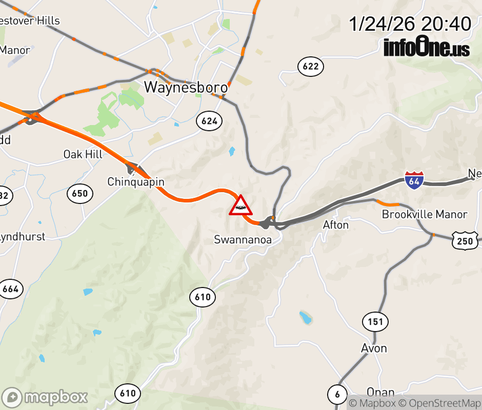 On I-64 at mile marker 99 in the County of Augusta, motorists can expect delays due to a vehicle crash. The west left shoulder and left lane are closed. Updated: Sat 1/24/26 8:40 PM EST ![]() |