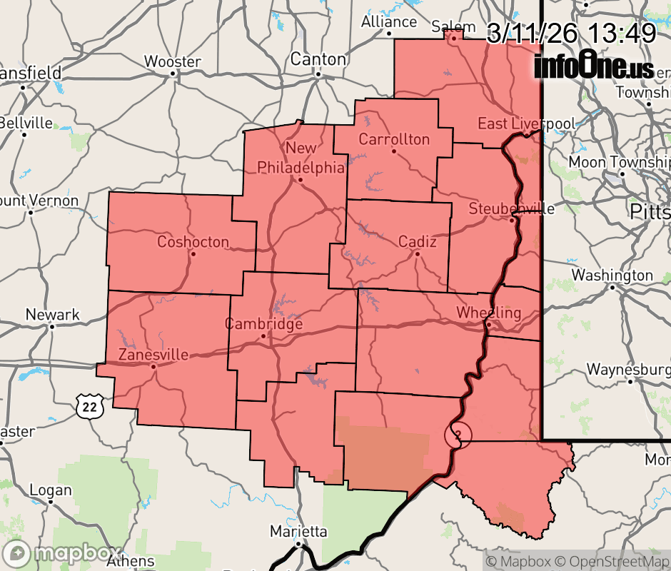 Canceled 3/11/26 2:48 PM Tornado Watch issued March 11 at 1:48PM EDT until March 11 at 5:00PM EDT by NWS Pittsburgh PA TORNADO WATCH 42 REMAINS VALID UNTIL 5 PM EDT THIS AFTERNOON FOR THE FOLLOWING AREAS IN OHIO THIS WATCH INCLUDES 11 COUNTIES IN EAST CENTRAL OHIO BELMONT CARROLL COLUMBIANA COSHOCTON GUERNSEY HARRISON JEFFERSON OH MONROE MUSKINGUM NOBLE TUSCARAWAS IN WEST VIRGINIA THIS WATCH INCLUDES 5 COUNTIES IN NORTHERN WEST VIRGINIA WETZEL IN THE NORTHERN PANHANDLE OF WEST VIRGINIA BROOKE HANCOCK MARSHALL OHIO THIS INCLUDES THE CITIES OF CADIZ, CALDWELL, CAMBRIDGE, CARROLLTON, COLUMBIANA, COSHOCTON, DOVER, EAST LIVERPOOL, FOLLANSBEE, MARTINS FERRY, MOUNDSVILLE, NEW MARTINSVILLE, NEW PHILADELPHIA, SALEM, ST. CLAIRSVILLE, STEUBENVILLE, WEIRTON, WELLSBURG, WHEELING, WOODSFIELD, AND ZANESVILLE. ![]() |