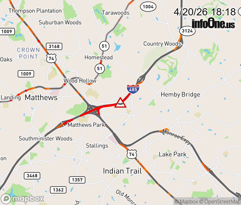 The right shoulder is closed past Exit 51 (US 74/ Independence Blvd). Updated: Mon 4/20/26 6:18 PM EDT ![]() Updated: Mon 4/20/26 6:18 PM EDT |