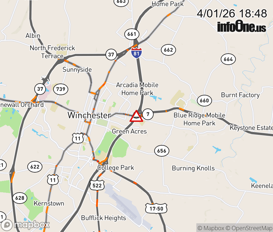 On I-81 at mile marker 315.5 in the County of Frederick, motorists can expect delays due to a vehicle crash. The south entrance ramp narrows. Updated: Wed 4/1/26 6:48 PM EDT ![]() Updated: Wed 4/1/26 6:48 PM EDT |