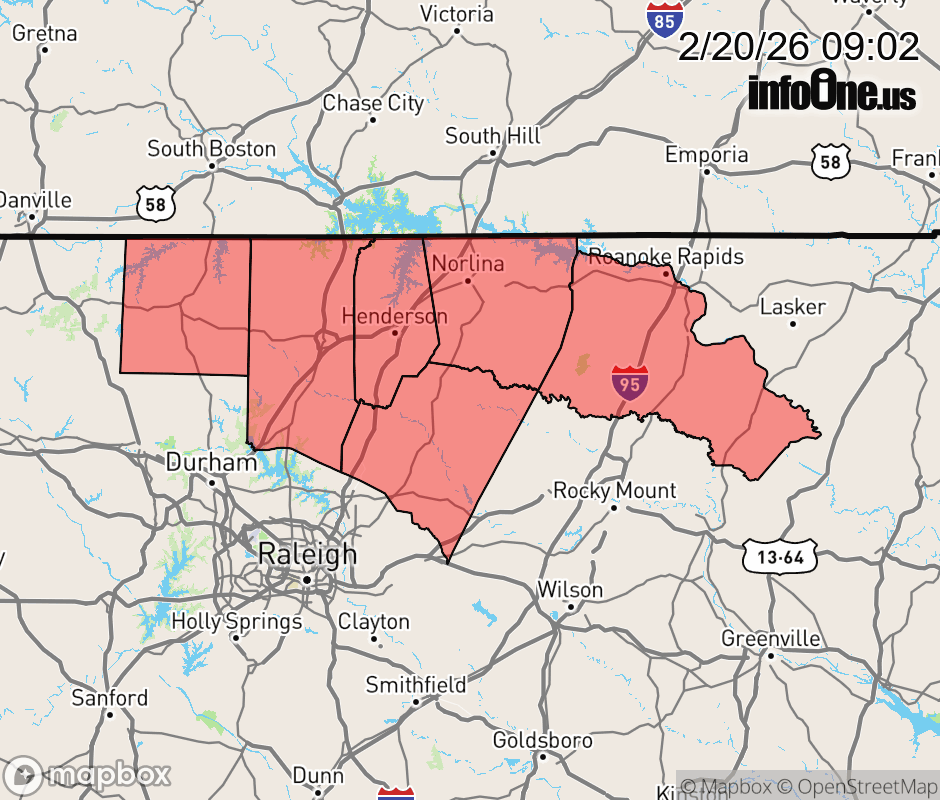 Canceled 2/20/26 10:00 AM Dense Fog Advisory issued February 20 at 9:01AM EST until February 20 at 10:00AM EST by NWS Raleigh NC * WHAT... Visibility one quarter to one half mile in dense fog. * WHERE... Franklin, Granville, Halifax, Person, Vance, and Warren Counties. * WHEN... Until 10 AM EST this morning. * IMPACTS... Low visibility could make driving conditions hazardous. ![]() |