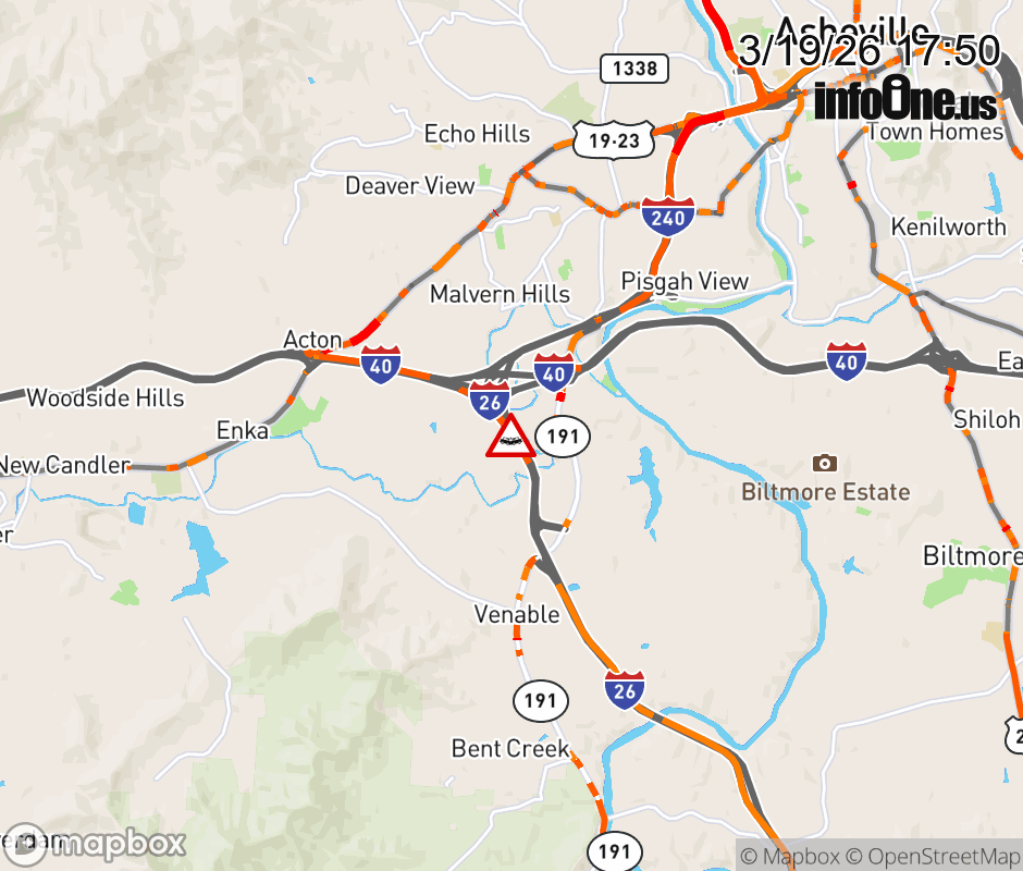 The left shoulder is closed 2 miles before Exit 33, NC 191 (Brevard Road). Updated: Thu 3/19/26 5:50 PM EDT ![]() Updated: Thu 3/19/26 5:50 PM EDT |