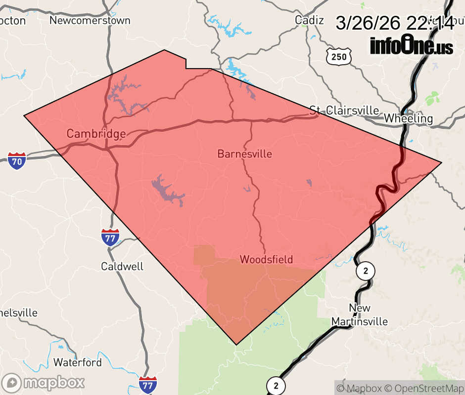 Canceled 3/26/26 10:27 PM Severe Thunderstorm Warning issued March 26 at 10:13PM EDT until March 26 at 11:00PM EDT by NWS Pittsburgh PA SVRPBZ The National Weather Service in Pittsburgh has issued a * Severe Thunderstorm Warning for... Belmont County in east central Ohio... Guernsey County in east central Ohio... Monroe County in east central Ohio... East Central Muskingum County in east central Ohio... Northeastern Noble County in east central Ohio... Marshall County in northern West Virginia... * Until 1100 PM EDT. * At 1013 PM EDT, a severe thunderstorm was located 10 miles northeast of Byesville, or 10 miles northeast of Cambridge, moving southeast at 40 mph. HAZARD...60 mph wind gusts and quarter size hail. SOURCE...Radar indicated. IMPACT...Hail damage to vehicles is expected. Expect wind damage to roofs, siding, and trees. * Locations impacted include... Cambridge, Moundsville, Bellaire, Barnesville, Woodsfield, Shadyside, Byesville, McMechen, Powhatan Point, Glen Dale, Benwood, Bethesda, Antrim, Quaker City, Senecaville, Belmont, Pleasant City, Beallsville, Lore City and Morristown. ![]() |