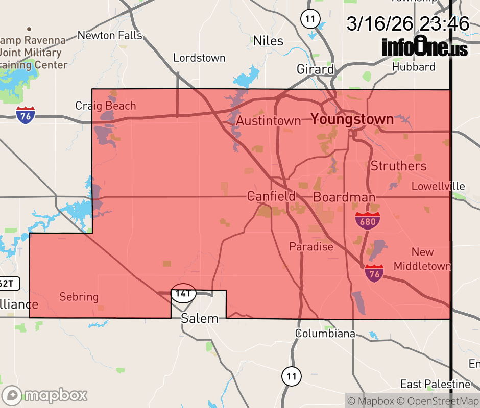 Canceled 3/17/26 4:00 AM Winter Weather Advisory issued March 16 at 11:45PM EDT until March 17 at 4:00AM EDT by NWS Cleveland OH * WHAT... Snow. Additional snow accumulations up to one inch. Winds gusting as high as 35 mph. * WHERE... Mahoning County. * WHEN... Until 4 AM EDT Tuesday. * IMPACTS... Plan on slippery road conditions. ![]() |