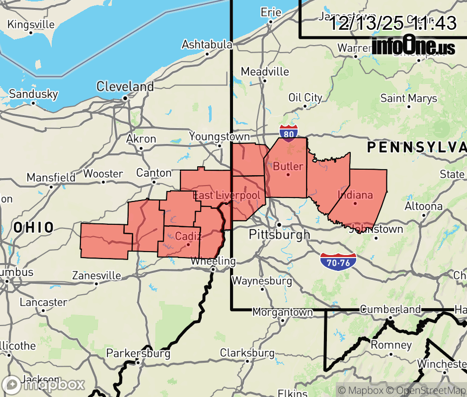 Canceled 12/13/25 5:33 PM Winter Weather Advisory issued December 13 at 11:41AM EST until December 14 at 1:00PM EST by NWS Pittsburgh PA * WHAT... Snow expected. Total snow accumulations between 3 and 6 inches. * WHERE... Portions of east central Ohio, southwest and western Pennsylvania, and northern West Virginia. * WHEN... Until 1 PM EST Sunday. * IMPACTS... Travel could be very difficult. ![]() |