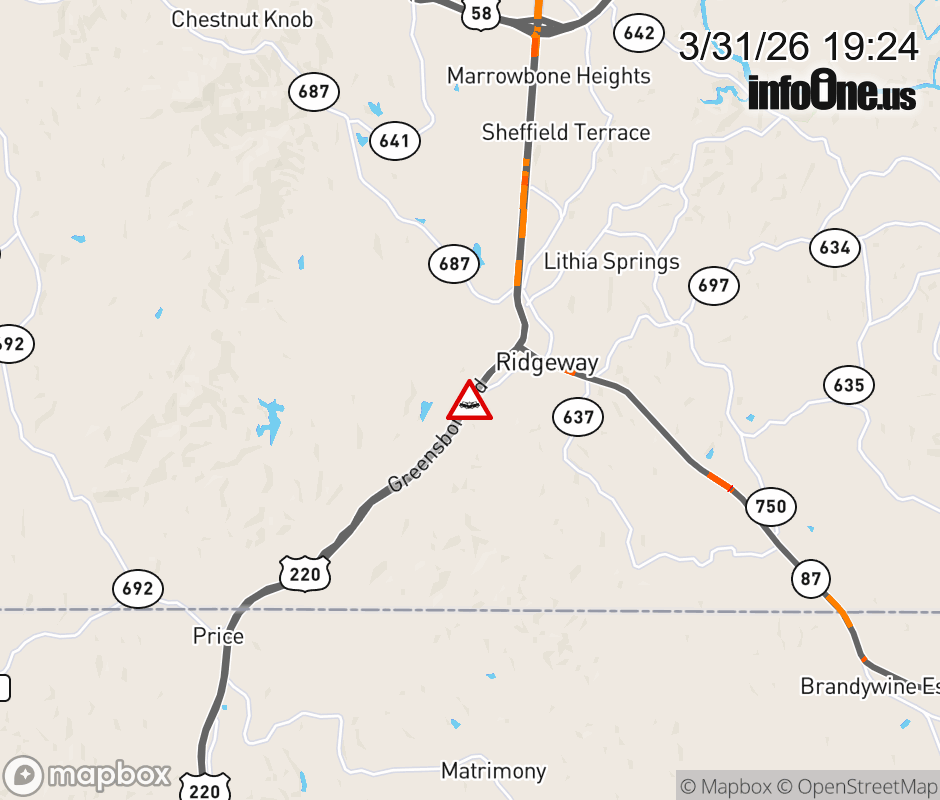 On US-220 North in the County of Henry, in the vicinity of Church St; Lee Ford Camp Rd; Rt. 688E/W (Henry County); BUS US-220N/S, BUS US-220N (5 Henry/Ridgeway), motorists can expect delays due to a vehicle crash. Lane closures exist. Updated: Tue 3/31/26 7:24 PM EDT ![]() Updated: Tue 3/31/26 7:24 PM EDT |
