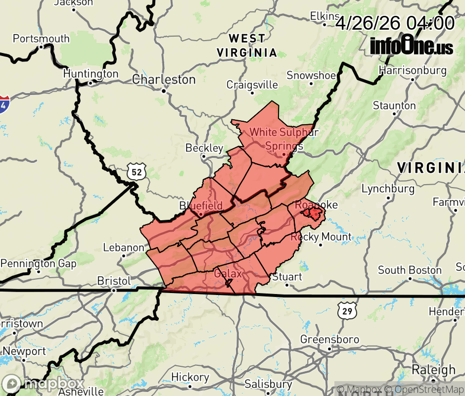 Special Weather Statement issued April 26 at 3:58AM EDT by NWS Blacksburg VA Patches of dense fog have formed in the New River Valley, Mountain Empire and Greenbrier Valley early this morning. At times visibility has been reduced to less than a quarter mile. If traveling, use caution in foggy areas, slow down and leave extra distance between vehicles. ![]() |