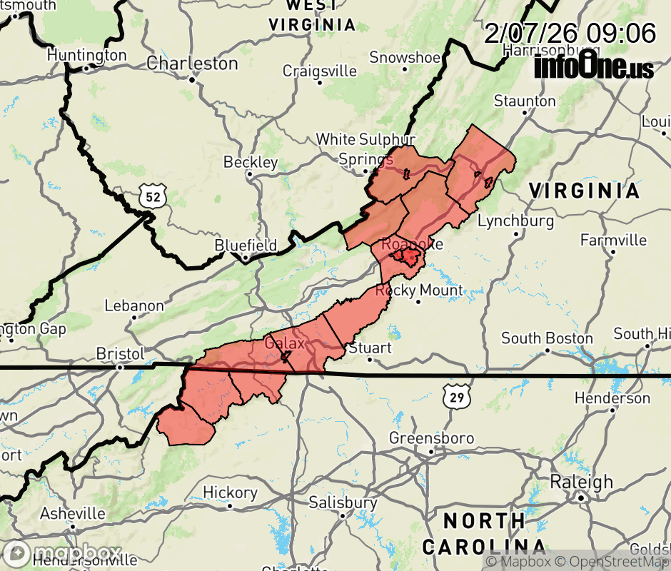 Canceled 2/7/26 2:22 PM Cold Weather Advisory issued February 7 at 9:05AM EST until February 8 at 7:00AM EST by NWS Blacksburg VA * WHAT... For the High Wind Warning, northwest winds 20 to 30 mph with gusts up to 60 mph. For the Cold Weather Advisory, very cold wind chills as low as 13 below. * WHERE... Portions of northwest North Carolina and southwest and west central Virginia. * WHEN... For the High Wind Warning, until 7 PM EST this evening. For the Cold Weather Advisory, until 7 AM EST Sunday. * IMPACTS... Damaging winds will blow down trees and power lines. Power outages are possible. Travel will be difficult, especially for high profile vehicles. The cold wind chills as low as 15 below zero could result in hypothermia if precautions are not taken. ![]() |