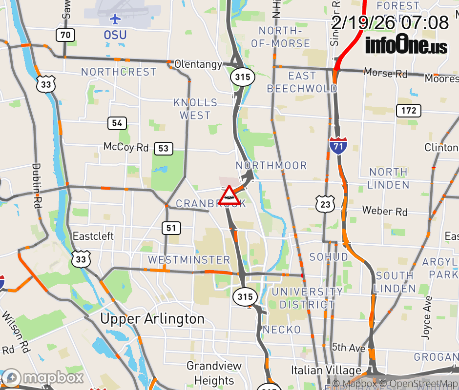 The left lane is blocked on SR-315 North beyond N Broadway/Olentangy River Rd, due to a crash. Updated: Thu 2/19/26 7:08 AM EST ![]() Updated: Thu 2/19/26 7:08 AM EST |